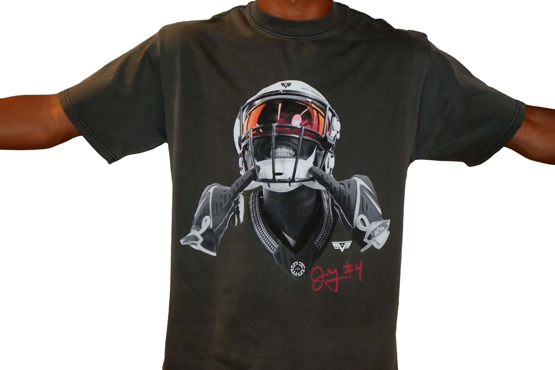 Make a statement with this striking Don't Hate, Appreciate black graphic tee, featuring a dynamic image of a Jay Timmons in full celebration mode. The design radiates energy—from the gleaming helmet visor to the confident pose—bringing the excitement of the game to life. With a splash of red detailing and the "#4" signature add a unique, collectible touch.